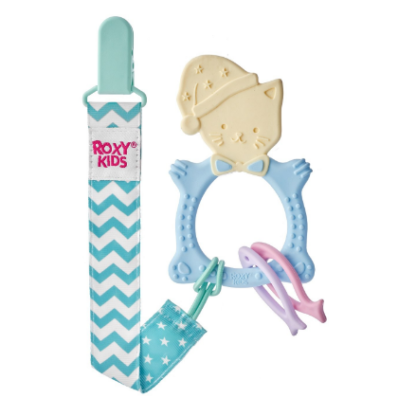Прорезыватель для зубов MEOW TEETHER от ROXY-KIDS подходит для всех стадий прорезывания зубов у малышей. Он состоит из элементов различной степени жесткости, что позволяет его использовать на протяжении всего времени прорезывания. На начальном этапе, когда у малыша раздражены десны, он может чесать их о мягкую рельефную голову котенка. На завершающем этапе малыш сможет грызть более твердое тело и жесткие элементы в виде рыбок. Прорезыватель сделан из безопасных гипоаллергенных материалов (термоэластопласта и полипропилена), так что ребенок может грызть его целыми днями. Еще одна особенность MEOW TEETHER – это тело, сделанное в форме кольца, которое малыш сможет удобно держать. Специальный держатель избавит ребенка от риска потерять или испачкать прорезыватель. Один конец держателя прикрепляется к прорезывателю, а второй при помощи специальной клипсы пристегивается к одежде ребенка. Держатель выполнен из двух слоев полиэстера, прочно сшитых вместе, поэтому он не износится и не порвется.